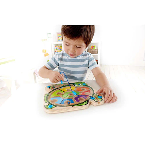 The gorgeous turtle shell of Hape's Colorback Sea Turtle makes for a very engaging magnetic marble maze. The colored marbles can be guided out of the turtle fin to the matching colored tiles on the Colorback Sea Turtle's shell! The maze toy is constructed according to the high-quality standards of Hape Toys, with Baltic Birch plywood and acrylic plastic firmly sealing the magnetic marbles inside the toy. For ages 24 months and up.