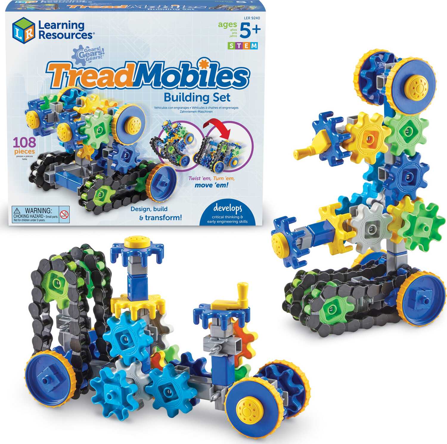 Gears, meet treads! Engineer your own twisting, turning creations with this 101-piece STEM building set’s colorful moving gears, then add extra fun with attachable rubber treads. Turn your creations into tanks, conveyor belts, and more! Follow along with included builds, or design your own creation. Works with all Gears! sets.